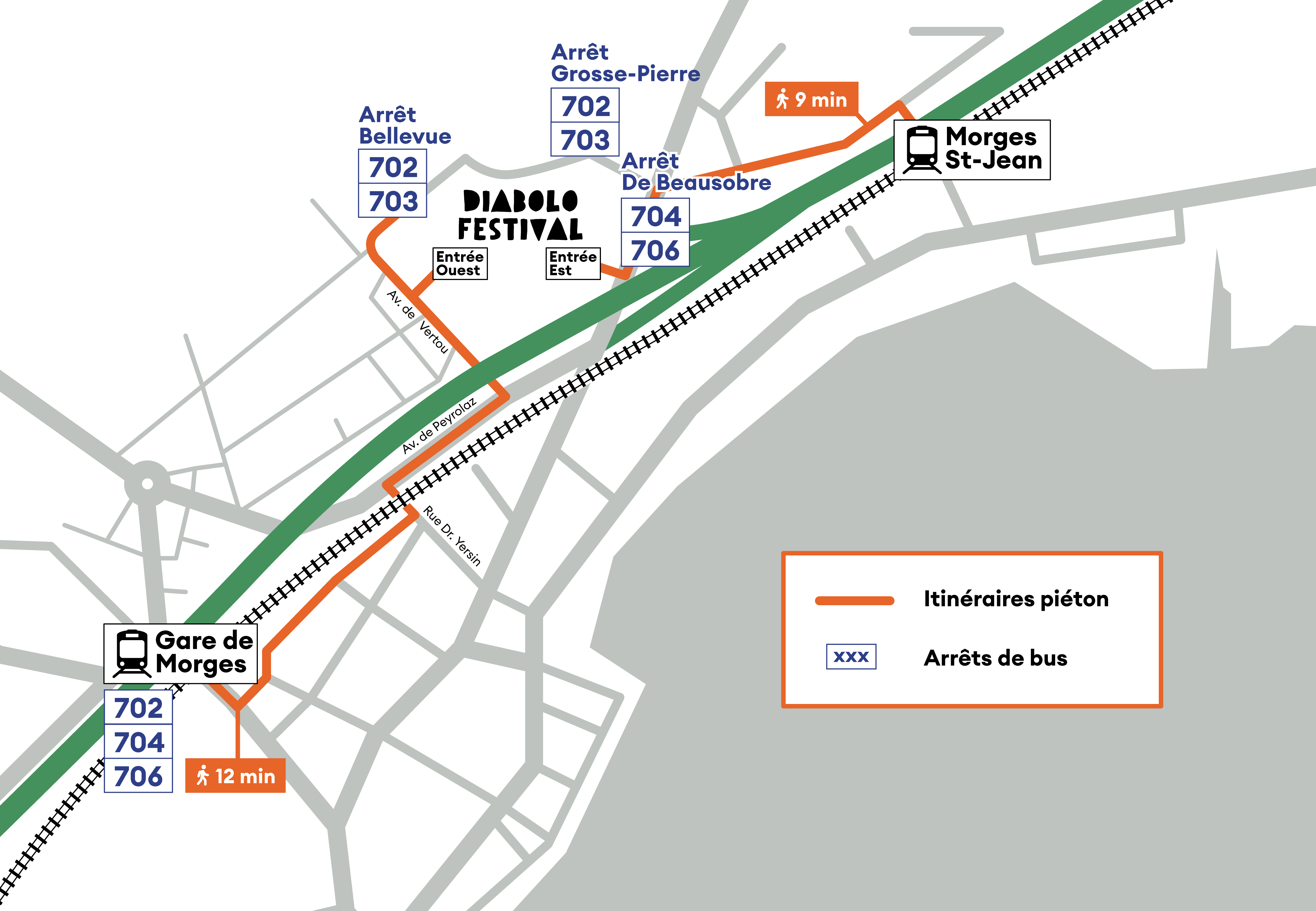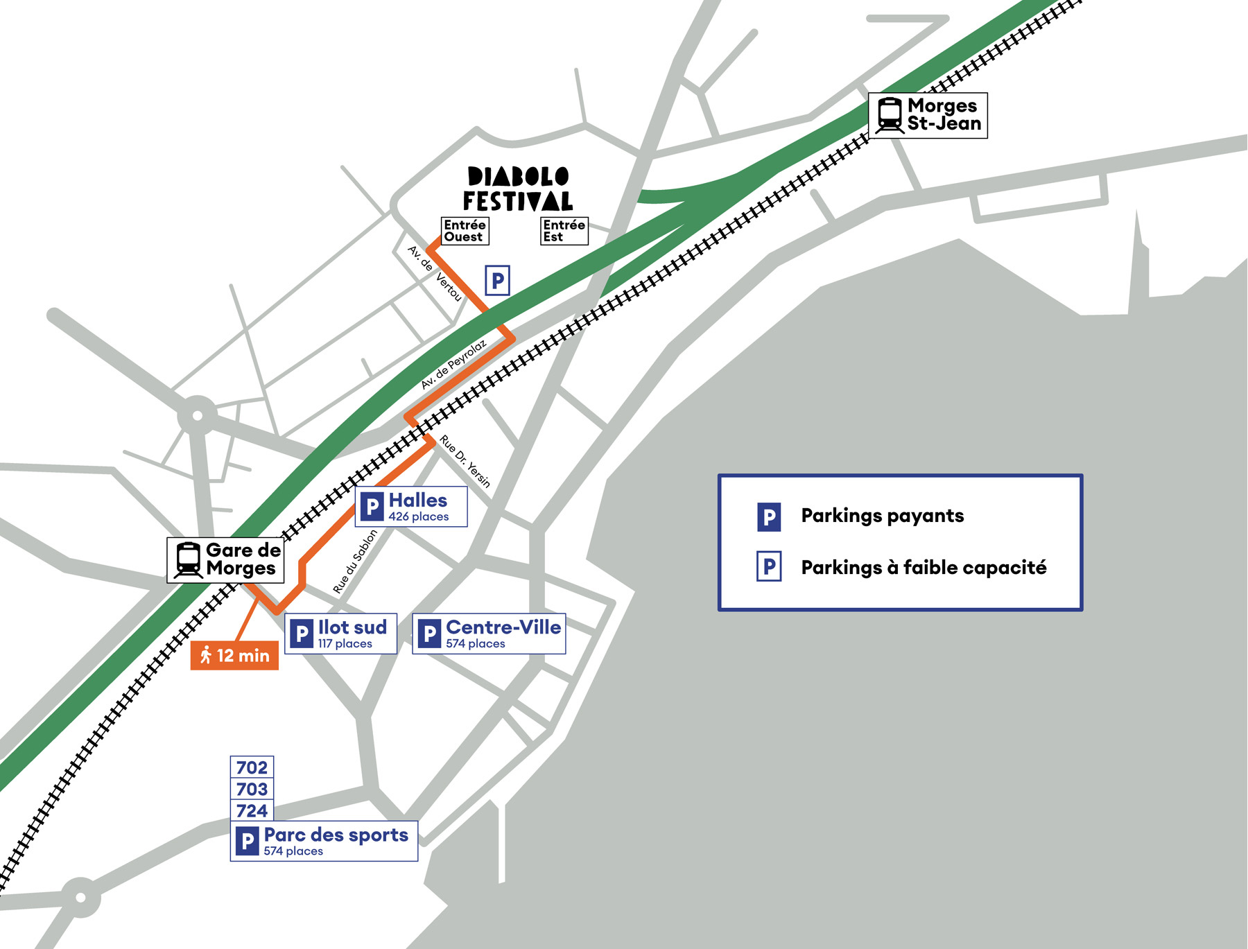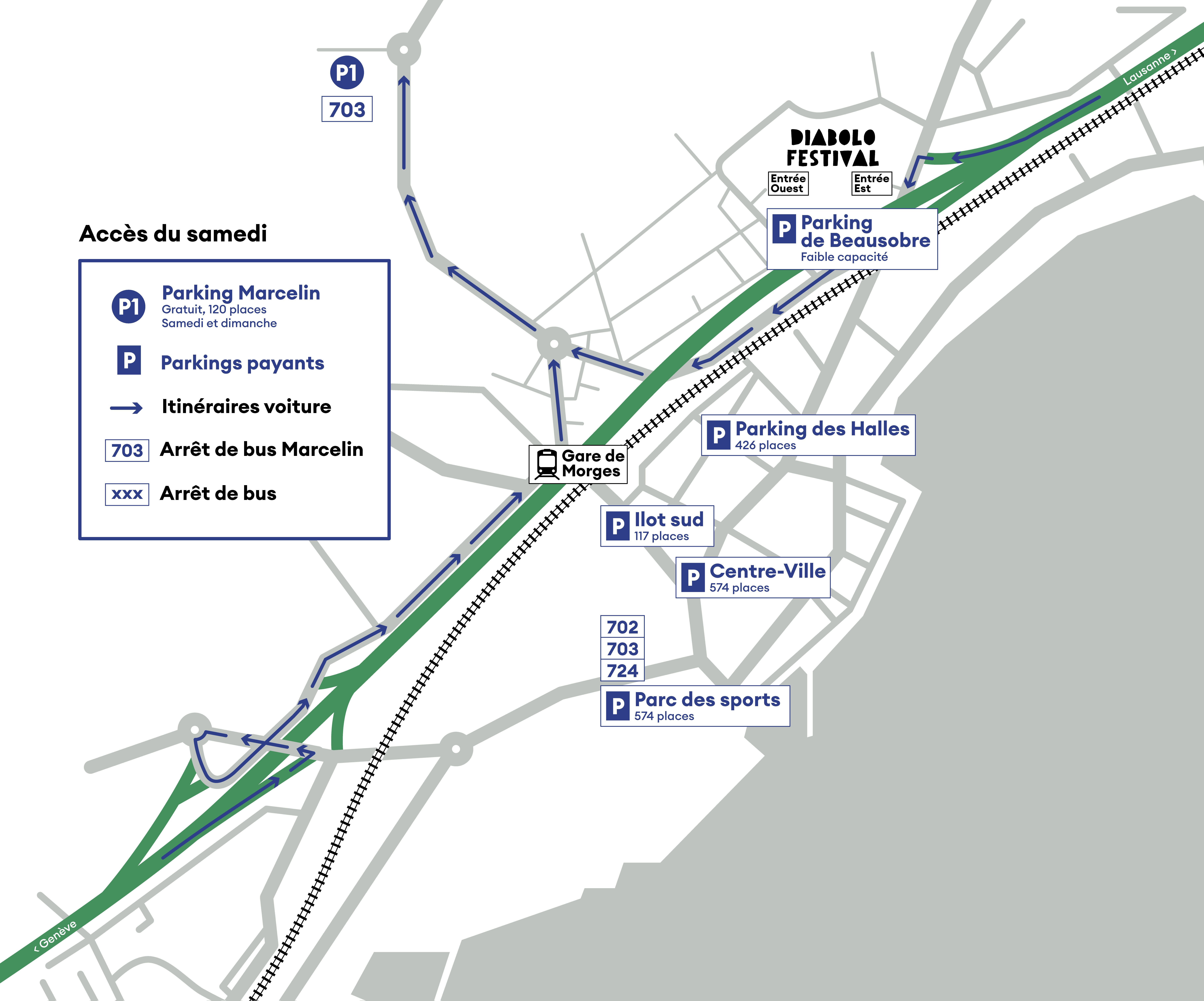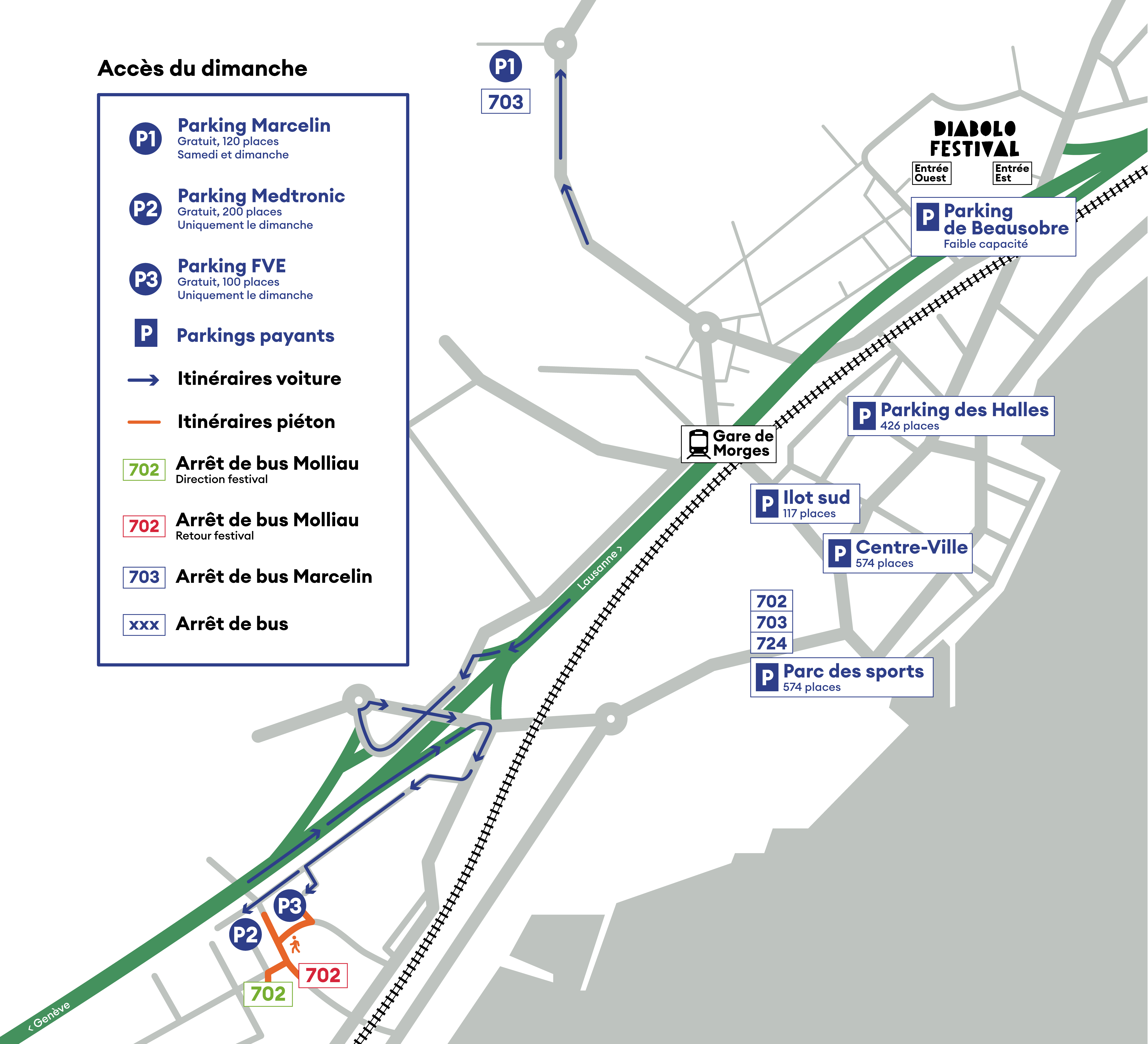 - Le Parking P1 de Marcelin (120 places), au ch. de la Morgettaz. Une ligne de bus spéciale vous déposera gratuitement et directement au festival toutes les 20 minutes. Il s’agit de la ligne 703 Diabolo Festival des MBC.